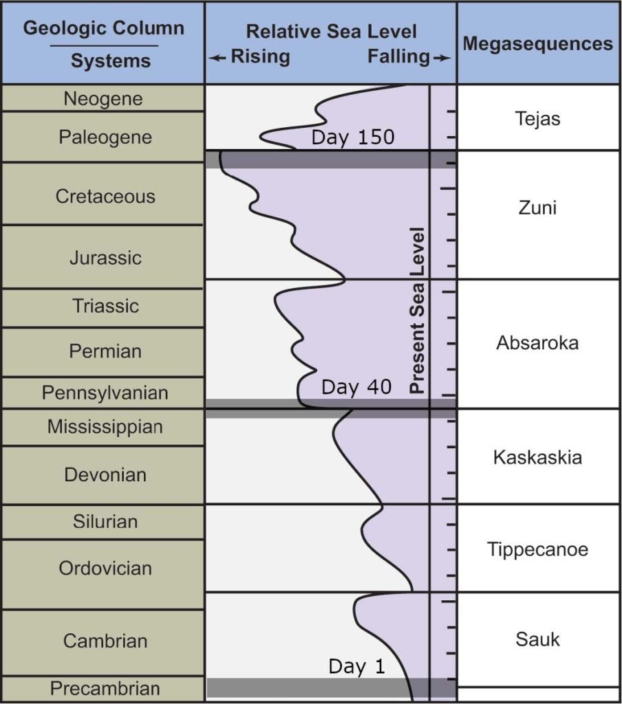 Especiação proporcional ao comportamento biodiferenciador observado está ausente pelo fato de existir apenas cerca de 250-300.000 tipos fósseis se repetindo dentre as estimativas de trilhões ou inumeráveis amostras, em todos os estratos geológicos até o pleistosceno (Woodmorappe, 2000; Sadava et al., 2009; Loceye Lennon, 2016). Este fato indica a ausência de sequências durante o processo de especiação quando contrastada com as estimativas de 8,7 milhões de espécies vivas atualmente (Mora et al., 2011). Este salto indica uma catástrofe no meio , assim como temos a obviedade de inicio de camadas sedimentares trazendo rica informação fóssil no ediacara/cambriano e todo o diferencial das camadas do fanerozoico com as pré-cambrianas, tudo nos fala de uma gigantesca catástrofe que iniciou sua deposição ali .