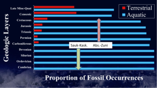 | Pobreza taxonômica (250 a 300 mil espécies) sobre estimativas de haver inumerável amostras fósseis. | De especiação incluindo e sobretudo em tempo real, diversidade, o que resultaria em riqueza de diversificação fóssil e menor disparidade de padrões, pela presença de maior número de padrões morfológicos. A pobreza taxonômica revela ausência de motores evolutivos atuando, o que implica em ausência de tempo geocronológico, que caso houvesse, permitiria a evolução como fato observado, ser identificada na evolução histórica. | O modelo de Sepultamento de populações ancestrais comuns dos quais derivariam a biodiversidade atual, exceto das morfologias extintas, se revela extremamente coerente com este padrão fóssil. |