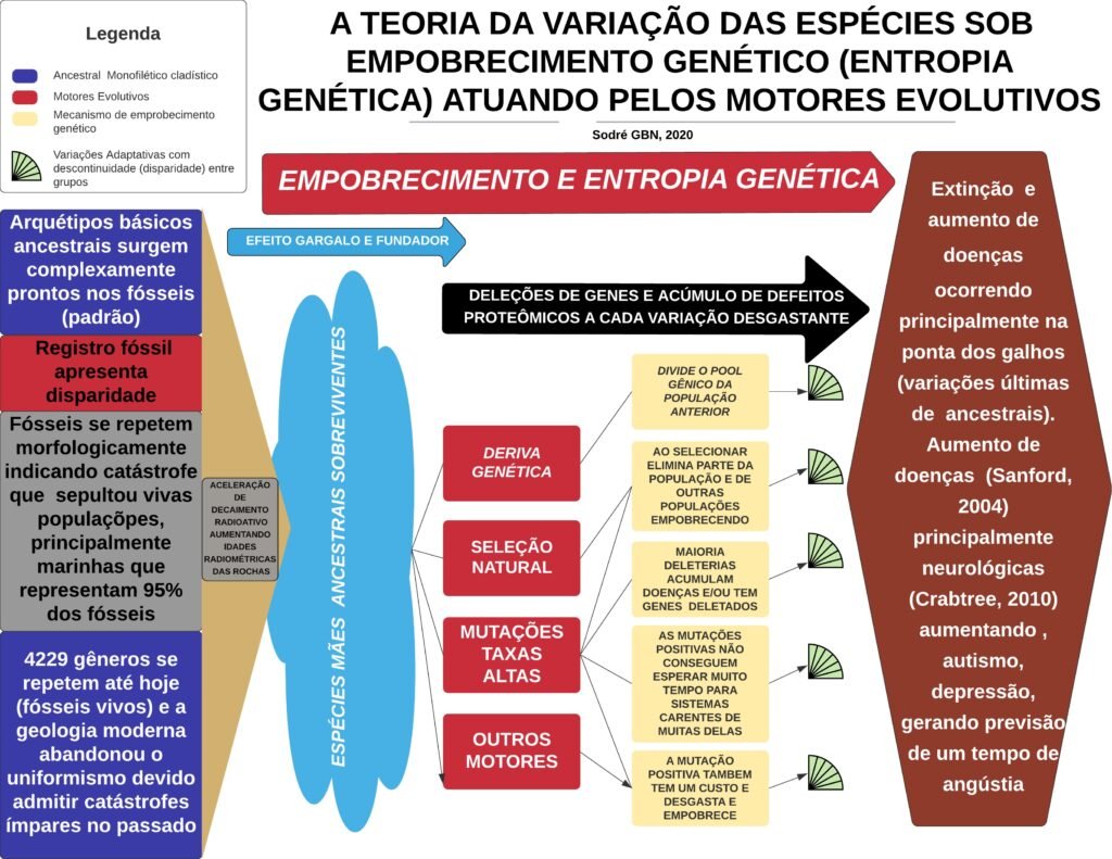 Introdução: A teoria da evolução biológica convencional fundamenta-se na premissa de que mutações aleatórias e seleção natural são capazes de gerar complexidade e viabilidade a longo prazo. No entanto, avanços na genética de populações e genômica comparativa sugerem um processo inverso: a degeneração sistemática do genoma pelo acúmulo de mutações deletérias, um fenômeno descrito como entropia genética [299].