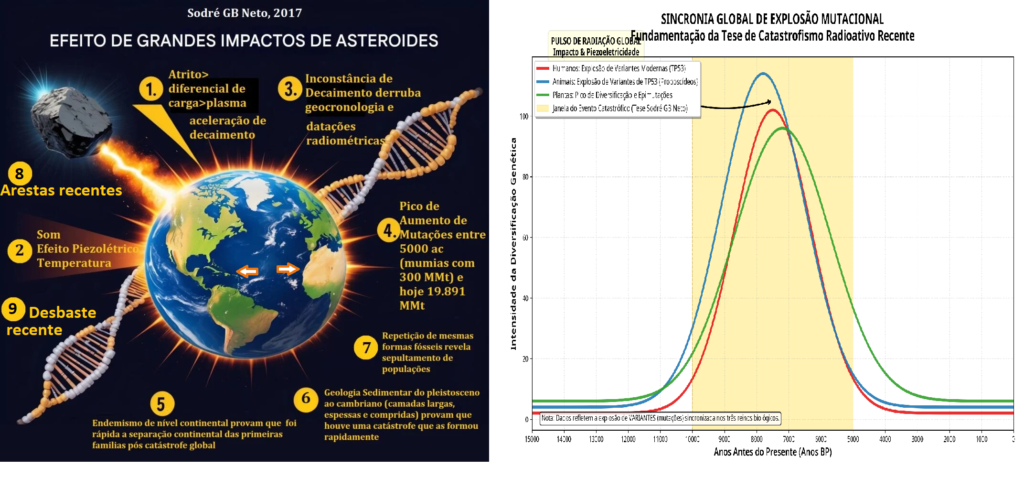 A validade da geocronologia uniformitarista é questionada pela evidência de decaimento radioativo acelerado [122, 123, 124, 125, 126, 127, 128, 129, 130, 131, 132, 133, 134, 135, 136, 137, 138, 139, 140, 141, 142, 143, 144, 145, 146, 147, 148, 149, 150, 151, 152, 153, 154, 155, 156, 157, 158, 159, 160, 161, 300]. Propõe-se que impactos de grandes asteroides no Holoceno geraram pressões mecânicas extremas na crosta terrestre, resultando em fenômenos de piezoeletricidade nuclear. Tais eventos liberaram fluxos massivos de nêutrons e radiação gama, alterando as proporções isotópicas usadas em datações e induzindo picos mutacionais globais [300].