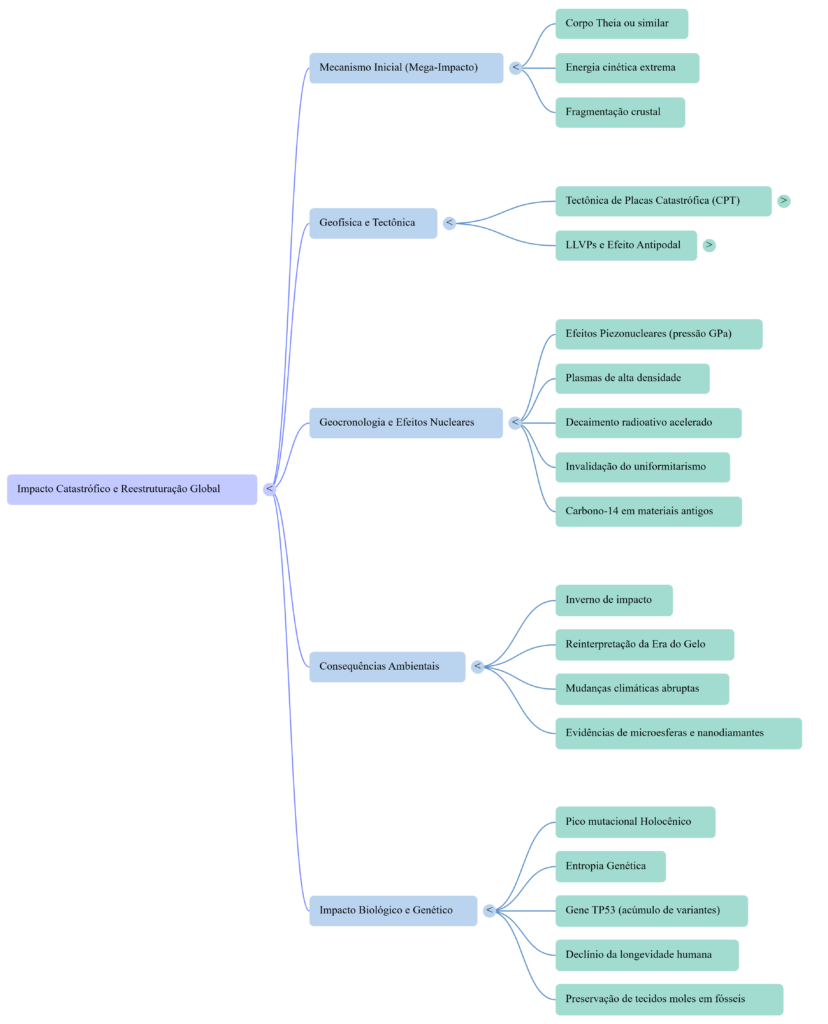 Este artigo apresenta uma síntese abrangente de um modelo geofísico e biológico integrado, propondo que um mega-impacto (frequentemente associado ao hipotético corpo Theia ou a um evento de magnitude similar) desencadeou uma série de eventos catastróficos globais. Argumenta-se que a energia cinética extrema deste impacto resultou na fragmentação crustal e na iniciação de uma tectônica de placas catastrófica, evidenciada pela subducção rápida de placas litosféricas antigas e frias no manto profundo. Além disso, as pressões na ordem de Gigapascals (GPa) geradas pelo impacto teriam induzido efeitos piezonucleares e a formação de plasmas densos, acelerando as taxas de decaimento radioativo e invalidando as premissas uniformitaristas da geocronologia convencional. O modelo também explica a formação das Grandes Províncias de Baixa Velocidade de Cisalhamento (LLVPs) como remanescentes do impactor, posicionadas de forma antipodal devido ao foco de ondas sísmicas. As consequências ambientais deste evento incluem um “inverno de impacto” severo, frequentemente interpretado como a última Era do Gelo. Biologicamente, a radiação intensa e o estresse ambiental teriam provocado um pico mutacional recente (Holocênico), evidenciado por alterações no gene TP53 e pelo declínio da longevidade humana, corroborando o conceito de entropia genética.