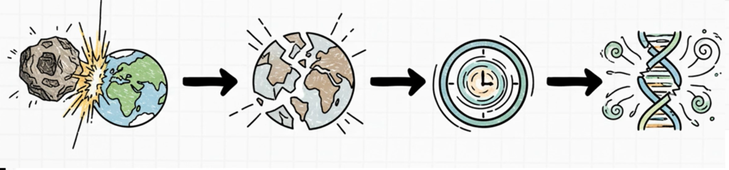 A radiação intensa resultante da aceleração do decaimento radioativo e da perda temporária do escudo geomagnético durante o impacto teria causado um estresse genômico sem precedentes na biosfera 78 79 80. Evidências genômicas apontam para um “pico mutacional” recente, ocorrendo entre 5.000 e 10.000 anos atrás 81 82.