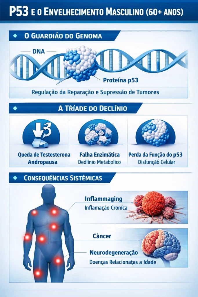 O envelhecimento humano é um processo complexo caracterizado pelo declínio progressivo das funções fisiológicas e pela perda da homeostase molecular. A proteína p53, conhecida como o “guardião do genoma”, desempenha um papel central na regulação do ciclo celular, reparo do DNA e apoptose [1]. No entanto, ao atingir a fase idosa, particularmente após os 60 anos, observa-se uma diminuição significativa na funcionalidade da p53 em homens [2]. Este fenômeno coincide com a andropausa e o declínio de diversas enzimas e proteínas essenciais [3]. Este artigo revisa os mecanismos moleculares subjacentes à perda de função da p53, a influência do declínio hormonal e as consequências para a estabilidade genômica e a longevidade [4] [36] [37] [38] [39] [40] [41] [42] [48] [49] [50] [51] [52] [53] [54] [55].